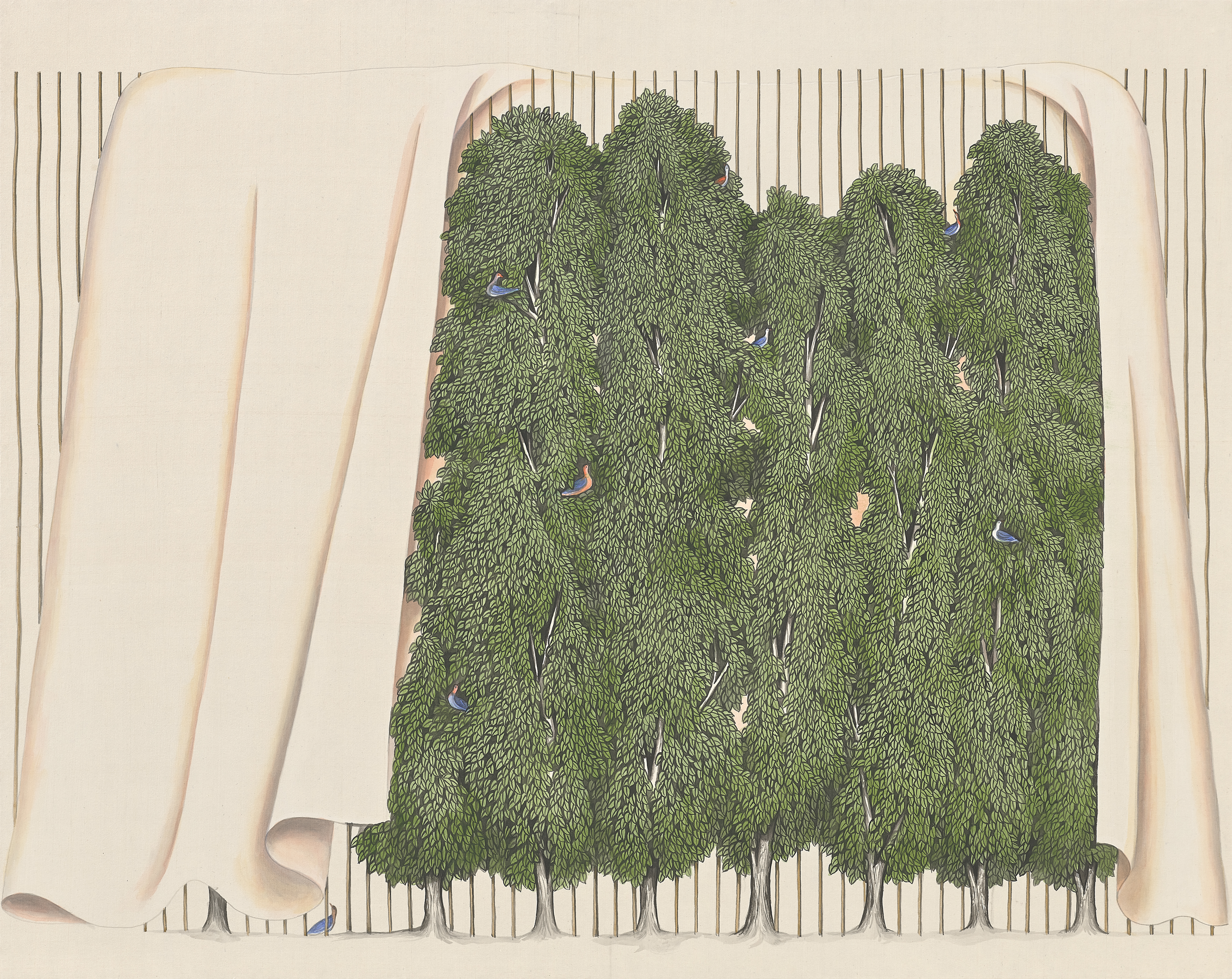 임현경 작가는 면밀히 관찰한 자연 풍경을 자기만의 방식으로 재해석하여 표현합니다. 빽빽한 나무들과 그 사이사이에 걸터 앉아있는 새들, 그리고 그들을 둘러싸고 있는 장막들은 작가 특유의 섬세한 감각으로 담담하고 조화롭게 화폭에 스며듭니다.