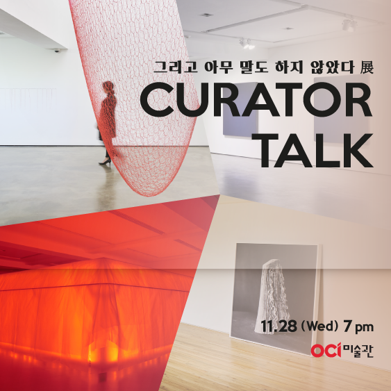OCI미술관은 기획전 <그리고 아무 말도 하지 않았다>를 맞이하여, 11월 28일 저녁 7시부터 큐레이터 토크를 진행하였습니다. 담당 큐레이터와의 전시 투어 이후 준비된 다과와 함께 전시에 관련된 흥미로운 이야기와 토론 시간을 가지게 되었습니다. 추운 날씨에도 방문해 주신 모든 분들께 진심으로 감사 드립니다.
