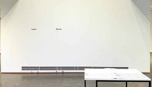 그리고 이 종이는 비스듬히 접힌다. 하얀 종이가 반으로 비스듬히 접히는 장면을 상상해본다. 종이는 접히면서 또 다른 면과 선을, 공간과 입체를 만들어 낸다. 접힌 두 개의 면 사이에는 분명한 선이 드러나고, 하나가 되지 못한 면들은 공간과 볼륨을 만들어 낸다. 여기서 접힌 두 개의 면을 구분해내는 선은 일종의 흔적이다. 종이가 접히지 않았다면, 접힌 면이 사라져버린다면 그 선은 존재하지 않는다. 이처럼 선은 사건을 통해 출몰하는 아주 작고 추상적인 세계이다. 때때로 점과 선은 특정 이론과 관점으로 설명되지 않는 무한한 세계로 정리되어버리곤 한다. 어떤 대상이 무한하다고 받아들여지는 순간 관련 사고는 더 이상 발전하지 못하고 허무하게 녹아버린다. 종이를 접는 행위는 그렇게 무한의 세계로 다가오는 대상에 특정 관계를 가설하려는 시도이다. 전시장의 여러 물리적 환경적 요소를 점, 선, 면의 성질로 해석하고 이를 데이터로 변환해 시각적 형태와 매체로 재구성하는 일련의 과정은 관계로 도드라지는 특별한 관점으로서의 대상-전시장을 공유한다. 하얀 종이를 비스듬히 접듯 점, 선, 면이라는 무한의 대상을 실제 세계로 특정해내는 것이다. 그렇게 얼핏 공허하게 또 건조하게 다가오는 행위들은 전시장에 가설 가능한 다양한 인지의 단면을 공유하며 그것이 언제든 다른 사고로 전환될 수 있음을 강조한다.