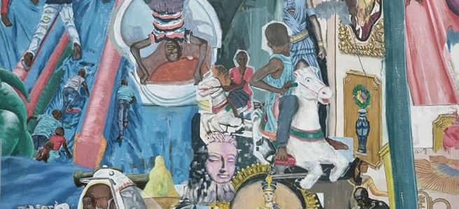 이제부터 테마파크 내부로 진입합니다. 이곳은 존재할 수 없는 유토피아를 현실화 한 세계입니다. 목적은 현실을 잃어버리는 것. 그리고 끊임없는 회전 속에 자신의 몸을 위탁하는 곳입니다. 사람들은 두려움을 위해 기꺼이 입장료를 지불합니다. 뱅글뱅글 돌아가는 수많은 기구는 알록달록하게 채색되어 있습니다. 겉모습에 속지 마세요. 만만하게 보면 안 됩니다. 퍼레이드가 곧 열릴 겁니다. 보세요. 태평양의 폴리네시아 지역의 민속춤이군요. 민속춤이란 식민화에 의하여 개발된, 그러니까 일종의 관광산업의 틀 안에서 기획된 문화적 양식이지요. 이국적인 몸짓과 육감적인 표현으로 이곳을 찾아온 손님들을 반겨주네요. 그러나 신선우는 정작 환상특급의 내용을 다루지는 않습니다. 여기엔 외계라든가, 괴물이라든가, 심리적인 환영으로 시달리는 사람을 찾아보기 어렵습니다. 오로지 시뮬라크르들의 묶음인 테마파크, 놀이공원 등의 클리셰를 끌어들입니다. 그에게 이곳은, 혹은 이러한 장르의 공간들은 푸코가 언급한 헤테로토피아와 다름없습니다. 불안을 야기하는 장소이기 때문이죠. 실상 테마파크는 유토피아가 재현된 곳입니다. 허구의 세계를 현실로 재현했으니까요. 그런데 왜 이곳에서 불안을 느낄까요? 푸코는 “유토피아는 이야기와 담론을 가능하게 하지만, 헤테로토피아는 얘깃거리를 메마르게 하고 말문을 막고 문법의 가능성을 그 뿌리에서부터 와해하고 신화를 해체하고 문장의 서정성을 아예 없애 버린”다고 설명합니다. 그러니까 헤테로토피아는 유토피아의 세계관이 붕괴된 상태라고 볼 수 있습니다. 테마파크란 원래부터 그런 곳이었습니다. 슬픔이나 상실이 부재하는 곳으로 설계되었기 때문입니다. 사람들은 이곳에서 픽션의 세계를 되찾고자 합니다. 오로지 행복, 환희, 만족만으로 형성된 세계이기 때문입니다. 다들 잘 아시겠지만 사막에 세워진 라스베이거스는 일년내내 도박을 즐길 수 있습니다. 일확천금의 희망과 세계적인 스타의 쇼가 사시사철 열리는 도시입니다. 라스베이거스의 건물들은 창이 없다죠. 왜냐면 이곳에서는 자연의 시간은 불필요합니다. 그래서 시간을 없애버린 것이죠. 라스베이거스는 테마파크의 원형이기도 합니다. 과학적 진보는 자본과 결합하여 이익 창출을 위한 수단으로 사용됩니다. 그렇게 시간과 계절을 동시에 잊을 수 있는 공간이 만들어졌습니다. 테마파크에 온 대개의 사람은 인공적으로 자연을 경험하고 공략하고 활용합니다. 자연의 시뮬라크르화, 그것이 테마파크를 세운 첫 번째 목적일 것입니다. 그러니까 과학기술의 발전으로 세워진 테마파크는 인위적으로 자연현상을 디자인한 “번역된 자연, 혹은 감각의 번역”이 일어난 시공간이라 부를 수 있습니다. 예를 들어 신선우에게 슬라이드란 용어는 크게 두 개의 의미로 다가옵니다. 하나는 테마파크의 워터풀에 설치된 거대한 미끄럼틀 기구이자 다른 하나는 전지구화된 시대에도 잔존하는 식민주의의 유령과 같은 이미지의 파편을 지시한다고 볼 수 있습니다(슬라이드, 2002). 슬라이드는 낙하를 위한 오름을 반복하는 놀이로 쾌락의 강도와 노동/운동 에너지의 공평하지 않은 엔트로피를 일으키는 행위일 것입니다. 회화의 화면은 슬라이딩을 즐기는 (흑인) 아동과 다양한 민속물, 유물이 혼재하는 이미지 파편들로 이뤄져 있습니다.
