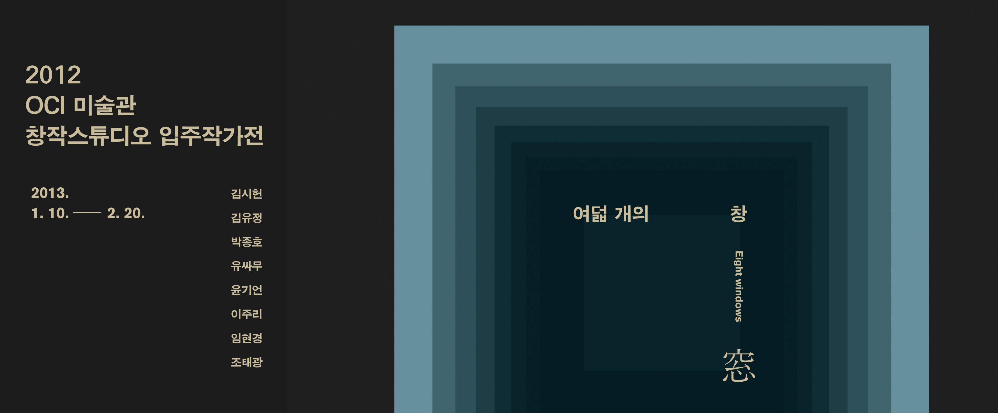 ‘여덟 개의 창(窓)’전은 8인의 입주작가들이 세상을 바라보는 비전의 창을 통해 그동안 쌓아온 열정과 노력의 결실을 한 자리에서 살펴보기 위해 마련되었다. 전시는 작품의 소재와 형식적 측면에서 ‘정지된 시간’, ‘움직이는 공간’으로 나뉜다. 찰나의 무한한 이야기를 담고 있는 ‘정지된 시간’ 섹션에는 김유정, 박종호, 임현경, 조태광 작가가, 끊임없는 움직임과 생성을 표현하는 ‘움직이는 공간’ 섹션에는 김시헌, 유싸무, 윤기언, 이주리 작가가 자리한다. 이번 전시는 입주작가들이 지속적인 만남과 토론을 통해 공유하고 준비한 것으로서, 작가 네트워크 형성과 창의적 담론 생성을 돕는 창작스튜디오의 긍정적인 힘을 보여준다는 점에서 더욱 의미가 있다. 8인의 작가들은 각자의 뚜렷한 개성과 방법론을 가지고 있지만, 이번 전시를 통해 작품에 대한 또 하나의 감상 방법과 시각을 제시한다.