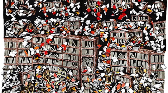 도서관에 빼곡히 쌓인 책들이 무너져 내리고, 난파선으로부터 쏟아진 온갖 책과 사물이 바다를 표류하는 가운데, 육식 동물이 출몰하여 책과 다투는 당혹스런 상황이 일어난다. 지극히 비현실적인 이 장면은 우정수의 개인전 ‘책의 무덤’의 몇 인상을 간추린 것이다. 그의 그림에서 무너지고 있는 거대한 도서관은 보르헤스가 상상한 ‘바벨의 도서관’을 연상시킨다. 흥미롭게도 바벨의 어원은 히브리어로 혼돈이다. 보르헤스는 이 도서관을 구상하면서 이미 인류의 미래를 예측한 듯하다. 끝없이 펼쳐지는 문명의 세계와 지식에 의해 구원받고자 하는 인간의 욕망, 하지만 결코 도달할 수 없는 비극적 상황은 우정수의 작업에서도 엿보인다. 그의 그림에서 빼곡한 책들은 바벨의 도서관이 은유하듯 인간이 구축한 문화, 문명을 암시한다. 문명의 진화를 의심치 않았던 선형적인 역사관은 오늘날 이미 무너져 내렸다. 전세계 곳곳에서 위기, 재난, 파국이 일어나는 가운데, 인간의 지식이 난국을 극복하고 찬란한 미래를 제시하리라는 기대는 없다. 이러한 상황을 감지하는 작가의 태도는 절망을 부르짖지도, 희망을 모색하지도 않는다. “하강하는 것도 아니고, 상승하는 것도 아닌 중간적인 상황”은 그림 속의 구조만을 뜻하지 않는다. 세상의 혼돈에 휩쓸린 채 표류하는 개인의 상황을 규명하고자 하는 의지로 이어진다. 인류에 대한 회의적인 생각, 세계 곳곳의 불안한 징후, 무엇보다도 이를 감지하는 한 개인의 실존적 고뇌로부터 이번 전시 ‘책의 무덤’이 시작된다.
