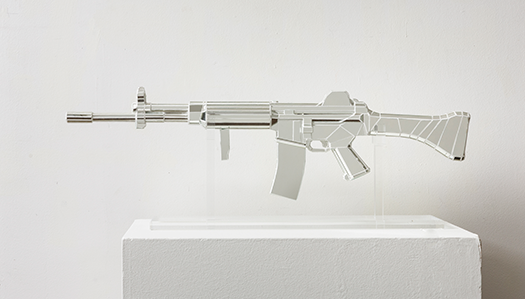 이번에 유쥬쥬는 프로파간다를 담은 작품들과 더불어 거울로 만든 18자루의 총과 5점의 병풍을 선보인다. 텍스트에서 다소 빗겨간 것들이다. 사실 시각예술가에게 텍스트는 다루기 쉽지 않은 요소 중 하나이다. 은유와 은폐가 덕목으로 여겨지고, 비-진리와 비-미학을 지향하는 현대미술에서 직접적으로 메시지를 전달하는 텍스트는 그에 반하는 것이 될 확률이 높기 때문이다. 하지만 작가는 영문으로 번역되어 사용되고 있는 프로파간다를 작품에 배치하고, 국문 표제를 달아놓음으로써 이에 대한 난제를 극복하고자 하는 듯 보인다. 실제로 매우 함축적으로 사용되는 영문 텍스트는 문학적, 상징적, 현실적 의미를 모두 내포하고 있으므로, 보는 이에 따라 다르게 해석될 확률이 높다. 하지만 이에 대한 국문 텍스트는 반대로 매우 명료하며, 다양한 해석의 여지를 차단한다. 총과 병풍 역시 매우 구체적인 형상에 속한다. 하지만 그것들은 유약한 거울로 만들어지면서, 누군가에게 상해를 입히고 외풍을 막아내는 본래의 도구성과 유용성이 훼손된 상태로 나타난다. 오히려 그 위에 맺히는 상은 그것을 바라보는 관객들의 왜곡된 또 다른 얼굴이다.