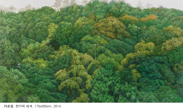 작가 이 현호의 작업 역시 이러한 맥락에서 살펴볼 수 있을 것이다. 그의 작업은 외형상 자연을 다루는 서정적인 내용을 지지체로 삼고 있다. 안정적인 색채의 운용을 통한 빼어난 묘사력은 작가의 작업 수평을 담보하는 기본적인 요건이라 여겨진다. 울창한 여름의 신록들이 가득한 화면은 일견 실경산수를 연상시키지만, 이를 산수라는 장르로 규정하기에는 무엇인가 마뜩치 않은 것이 사실이다. 그렇다고 이를 단순히 풍경으로 수렴해 버리는 것 역시 불만일 수밖에 없다. 그의 작업은 바로 산수와 풍경의 미묘한 경계에 위치하는 것으로 굳이 이를 구분하는 것 자체는 별반 특별한 의미를 갖기 어려울 것이다. 이는 바로 확장된 한국화 외연의 한 자락이기 때문이다.