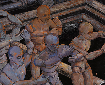 작가는 이 장대한 벽화로 둘러싸인 가운데 벽면의 앞면과 뒷면에는 각각 관절부위가 접히는 사지(四肢)를 지닌 기계인간을 표현한 작품들을 설치할 계획이다. 앞면의 벽에 걸린 세로로 긴 작품에는 공장의 설비들이 조밀하게 자리 잡은 비좁은 공간에 배치된 로봇이 기계적인 동작을 취하고 있는 반면 뒷면의 벽에는 세 개의 화폭을 가로로 연결한 캔버스에 서로 마주보며 마치 거울처럼 동일한 동작을 취하고 있는 여섯 기의 로봇이 그려져 있다. 인간의 형상을 하고 있으나 황금색으로 칠해진 이 금속성의 기계가 인간이 아니라 로봇임을 증명하는 A23, A25와 같은 일련번호는 영화 <블레이드 러너>에서 지구로 잠입한 복제인간(replicant)인 ‘넥서스 6(Nexus 6)’을 연상시킨다. 민머리에 신체의 각 부위가 조립된 듯한 특징을 드러내는 이 로봇이 비록 인간의 형상을 지니고 있다고 할지라도 성(性)의 구별이 없다. 이런 점이 이 인간의 형상을 닮은 기계를 오토마타, 마리오네트, 로봇이거나 사이보그처럼 보이도록 만든다. 이것을 꼭 기계인간으로 단정하지 않는다 하더라도 이 인간들은 <모던 타임스>에서 나사를 조이는 단일공정에 익숙해진 나머지 신경쇠약에 걸린 찰리 채플린처럼 기계의 일부가 되어버린 인간을 상징한다고 볼 수도 있을 것이다.